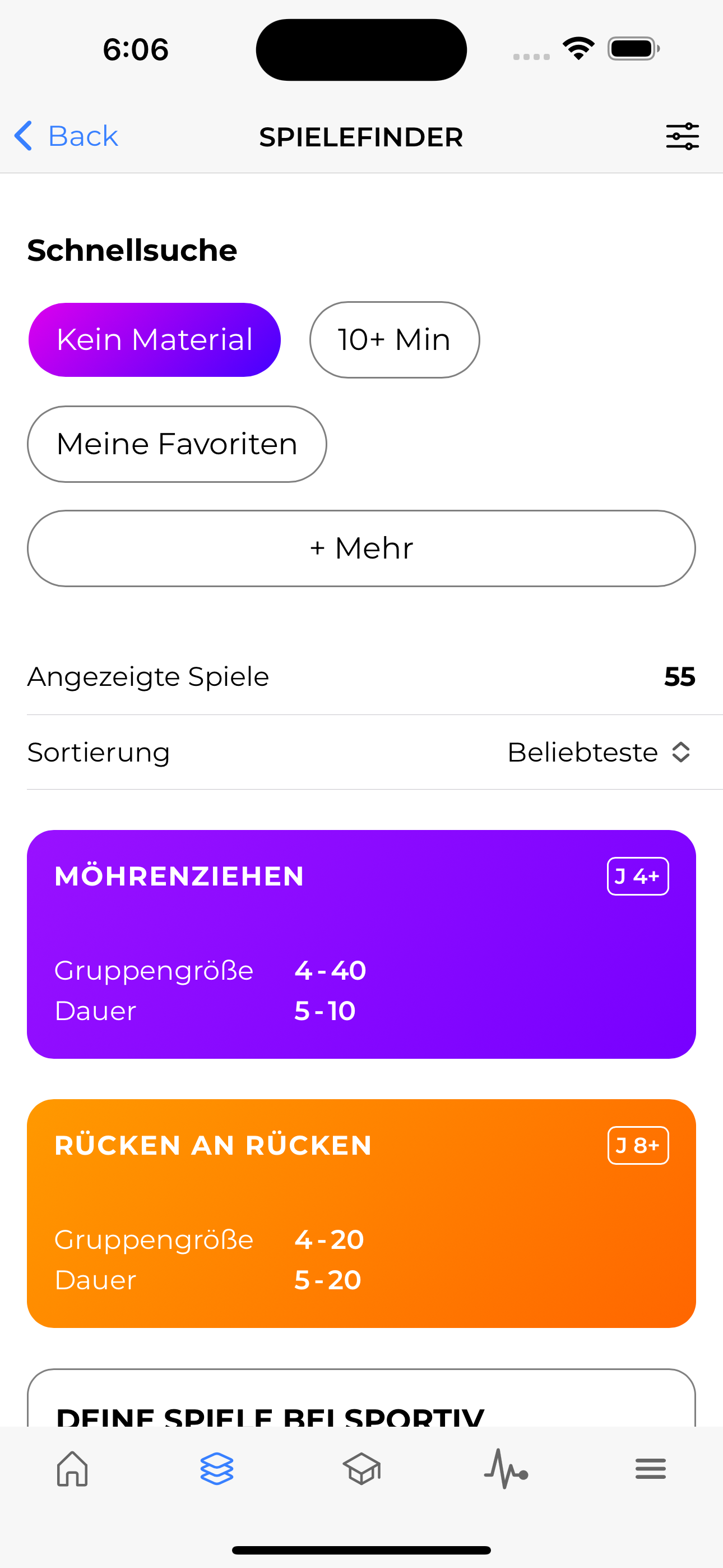 Tauche ein in eine Welt voller Inspiration mit Hunderten von Spielen, die speziell darauf ausgerichtet sind, Deine Trainingseinheiten abwechslungsreicher und effektiver zu gestalten. Der Sportiv-Spielefinder ist Dein Schlüssel zu einer riesigen Auswahl an Anregungen, die sowohl Spaß machen als auch die Fähigkeiten Deiner Athlet:innen fördern. Egal, ob Du nach Aufwärmübungen, Teambuilding-Spielen oder spezifischen Sportarten suchst – unsere umfangreiche Bibliothek hat alles, was Du brauchst, um jedes Training schnell und zugleich motivierend zu gestalten.